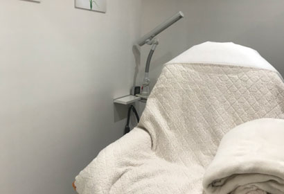 グレーと白を基調とした広々とした空間の中で、テレビやDVDを見ながら施術頂けます。